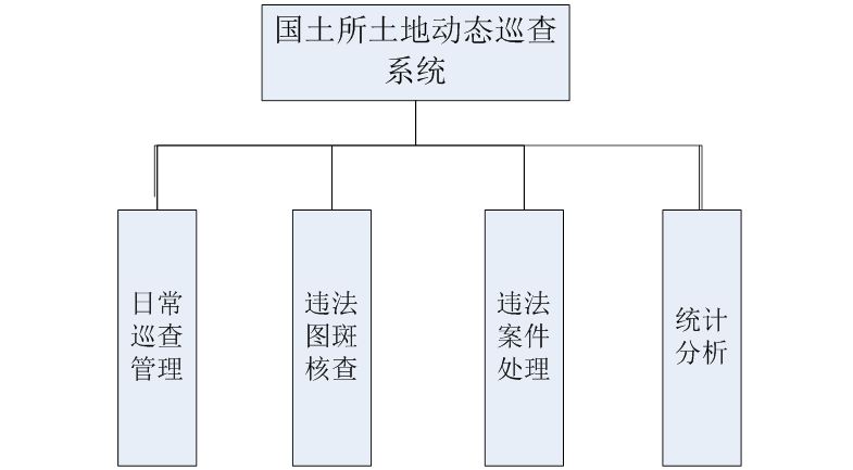 土地執(zhí)法監(jiān)察系統(tǒng)是國(guó)土資源信息化建設(shè)的一個(gè)有機(jī)組成部分,整個(gè)系統(tǒng)功能主要包括:日常巡查管理、違法圖斑核查、違法案件處理、統(tǒng)計(jì)分析等模塊,如下圖所示: