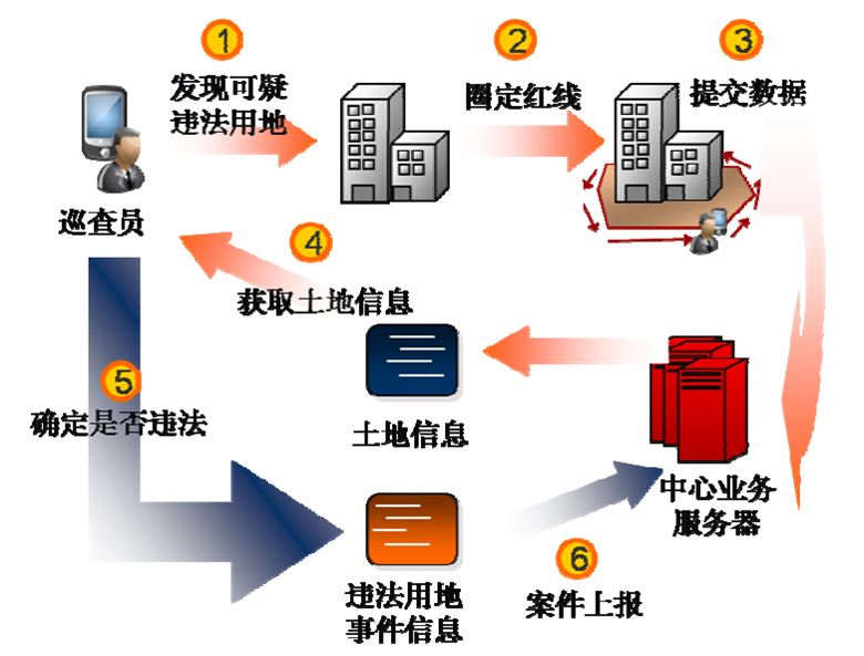 其中日常巡查管理和違法圖斑核查要求巡查員要對(duì)對(duì)象用地進(jìn)行紅線核查,并結(jié)合原有土地利用現(xiàn)狀和規(guī)劃數(shù)據(jù)進(jìn)行分析,核查其是否存在違法用地現(xiàn)象,根據(jù)分析結(jié)果進(jìn)行違法執(zhí)法處理,并統(tǒng)計(jì)上報(bào)。