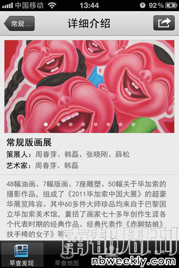 創(chuàng)刊時曾打著低于一折的折扣到處尋找廣告客戶;到現(xiàn)在網(wǎng)絡(luò)版上線,“解決了版面上廣告放不下的問題。”黃墨寒創(chuàng)辦《早查藝術(shù)地圖》,一年內(nèi)就實現(xiàn)了盈利。野心勃勃的他,甚至打起移動終端的主意,在新年伊始上線了APP版“早查藝術(shù)”。他策劃的這種集地圖搜索、垂直訂票和即時通信于一體的移動終端,被IT技術(shù)人士戲稱為“把web1.0 2.0 3.0的構(gòu)想打了個結(jié)”。