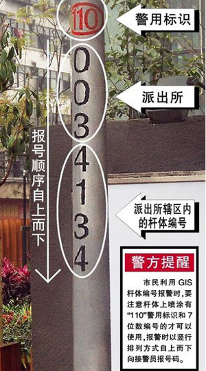 市民利用GIS桿體編號(hào)報(bào)警時(shí),要注意桿體上噴涂有“110”警用標(biāo)識(shí)和7位數(shù)編號(hào)的才可以使用,報(bào)警時(shí)以豎行排列方式自上而下向接警員報(bào)號(hào)碼。