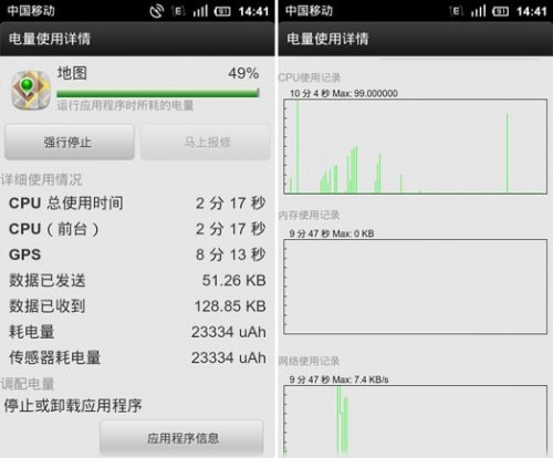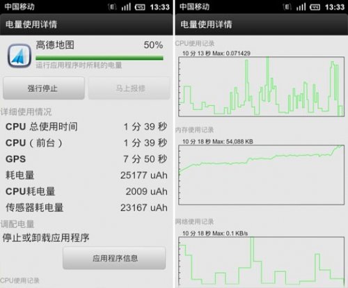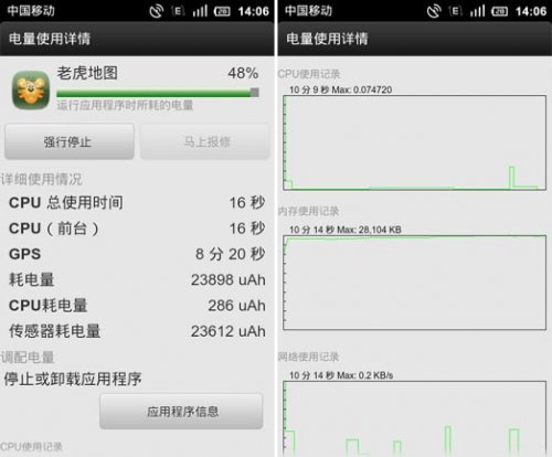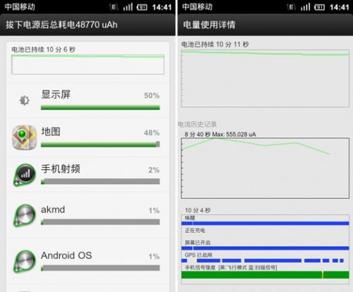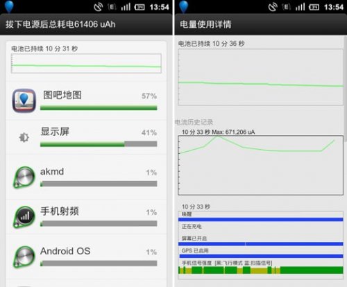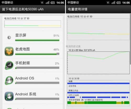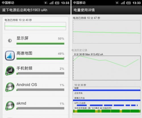 由上圖可見(jiàn),在10分鐘的測(cè)試結(jié)束后手機(jī)系統(tǒng)總耗電量為50390μAh,即50.39mAh,是目前最省電的一款地圖軟件,老虎地圖軟件本身的耗電量?jī)H為23898μAh。