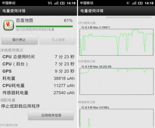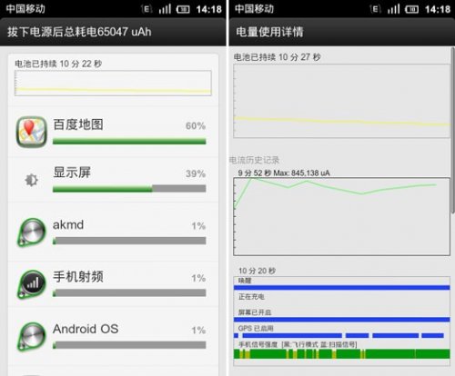 由上圖可見(jiàn),在10分鐘的測(cè)試結(jié)束后手機(jī)系統(tǒng)總耗電量為65047μAh,即65.047mAh,是目前耗電量最大的一款地圖軟件,而百度地圖本身 的耗電量達(dá)到了38818μAh,也是系統(tǒng)總耗電量高的主要原因??赡苓@與百度地圖支持羅盤(pán)模式有關(guān),因?yàn)樵诹_盤(pán)模式下會(huì)有部分3D效果,必然會(huì)比2D的 地圖消耗更多電量。