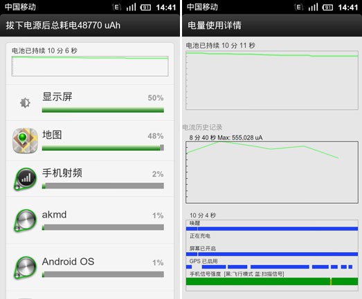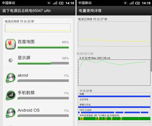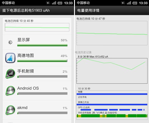 由上圖可見,在10分鐘的測試結(jié)束后手機系統(tǒng)總耗電量為65047μAh,即65.047mAh,是目前耗電量最大的一款地圖軟件,而百度地圖本身的耗電量達到了38818μAh,也是系統(tǒng)總耗電量高的主要原因??赡苓@與百度地圖支持羅盤模式有關(guān),因為在羅盤模式下會有部分3D效果,必然會比2D的地圖消耗更多電量。