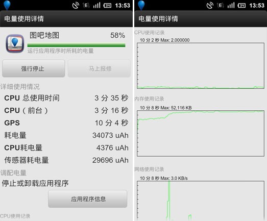 由上圖可見,在10分鐘的測試結(jié)束后手機系統(tǒng)總耗電量為61406μAh,即61.406mAh,相比之前的高德地圖耗電量增加不少,而增加的耗電量基本是由圖吧地圖軟件本身產(chǎn)生的,10分鐘的測試中圖吧地圖自身耗電量達到了34073μAh。