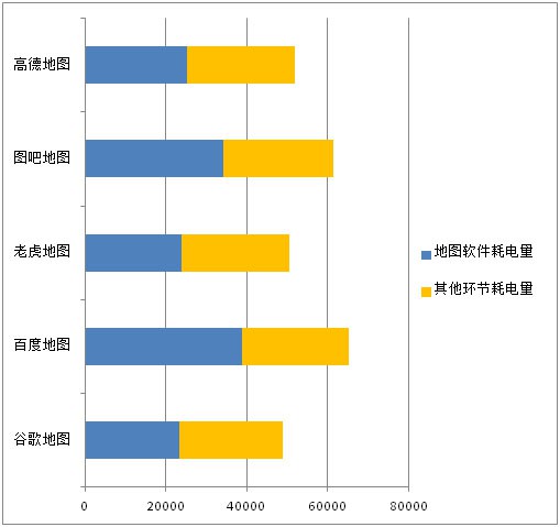由于圖中黃色部分代表的其他環(huán)節(jié)耗電量主要取決于屏幕耗電,而相同時間和相同亮度的情況下屏幕耗電量相差很小,所以系統(tǒng)的總耗電量還是取決于地圖軟件本身的耗電量,即圖中的藍色部分。