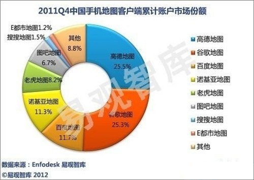 近日,據(jù)易觀智庫產(chǎn)業(yè)數(shù)據(jù)庫最新發(fā)布的《2011年第4季度中國手機(jī)地圖客戶端市場監(jiān)測報告》顯示,國內(nèi)各地圖手機(jī)廠商的市場份額及排名有了新的變化:高德地圖在中國手機(jī)地圖客戶端占有率上超越了谷歌,拿下25.5%的市場份額,躍升至行業(yè)第一的位置。而因經(jīng)營策略和中國國內(nèi)政策等原因,谷歌地圖在行貨版安卓手機(jī)中普遍被閹割,國內(nèi)手機(jī)地圖市場的格局也在經(jīng)歷著微妙的嬗變。