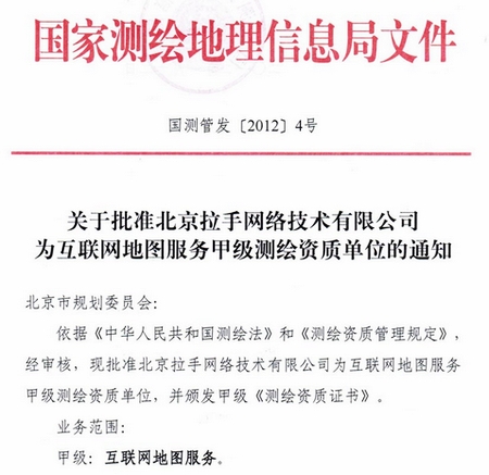 拉手網(wǎng)獲互聯(lián)網(wǎng)地圖服務(wù)甲級(jí)測(cè)繪資質(zhì)