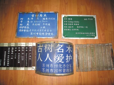從上世紀(jì)70年代末的“古樹(shù)名木人人愛(ài)護(hù)”搪瓷鐵牌,到分別于1983年以后、2004-2005年使用的標(biāo)注樹(shù)木基本資料的搪瓷鐵牌、鋁制烤漆標(biāo)識(shí)牌,再到仿古書(shū)簡(jiǎn)式的有機(jī)玻璃標(biāo)識(shí)牌……截至上月初,市區(qū)古樹(shù)名木已全部掛上第4代新“身份證”。昨天,古樹(shù)名木四代“身份證”,共計(jì)566塊,由市綠化管理站正式移交蘇州園林檔案館,填補(bǔ)了蘇州園林綠化實(shí)物檔案的空白。