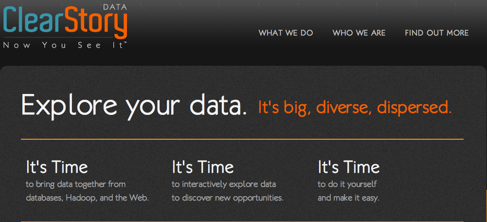 也許,這個加州Palo Alto的五人團隊為現在互聯(lián)網界中的大數據行業(yè)提供了一個最好的解讀。當大家還大多都收集過多數據,或者將它們存儲在新的云端數據庫中的時候,ClearStory卻在搭建最大的數據客戶群。