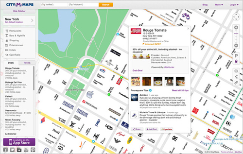 另類地圖服務(wù)Citymaps便是這種思路的產(chǎn)物:它只通過(guò)各種各樣的logo來(lái)展現(xiàn)城市的模樣(目前只支持紐約市、奧斯丁和舊金山三個(gè)城市)。和我們常見的衛(wèi)星圖、街景等展現(xiàn)辦法不同,Citymaps地圖會(huì)用各種品牌logo和許多相應(yīng)的優(yōu)惠券來(lái)幫你找尋目的地,還能按餐廳、酒吧和夜生活、購(gòu)物、娛樂(lè)進(jìn)行分類顯示,查看起來(lái)更加方便。