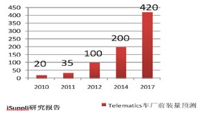 在北美及歐洲國家,新車型的車載信息服務(wù)安裝率均超過25%。在中國,盡管車載信息服務(wù)產(chǎn)業(yè)處于起步階段,但潛力巨大。如圖3,圖4所示,2010年,我國汽車產(chǎn)銷量超過1800萬輛,保有量超過8000萬輛。預(yù)計(jì)至2017年車廠前裝量將達(dá)到420萬輛,占到銷量的25%。如果算上10%后裝市場,2017年累計(jì)用戶可到達(dá)2000萬以上規(guī)模。而且這個(gè)信息服務(wù)市場還可拓展到車主本人、車主的家庭,市場空間非常大。因此,各大運(yùn)營商對(duì)汽車信息服務(wù)市場給予了極大關(guān)注。對(duì)于運(yùn)營商來說,發(fā)展車載業(yè)務(wù)有如下幾個(gè)好處: