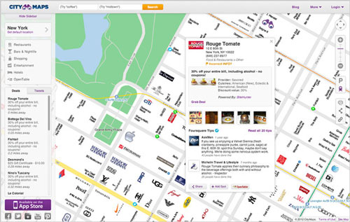 另類地圖服務(wù)Citymaps便是這種思路的產(chǎn)物:它只通過各種各樣的logo來展現(xiàn)城市的模樣(目前只支持紐約市、奧斯丁和舊金山三個(gè)城市)。和我們常見的衛(wèi)星圖、街景等展現(xiàn)辦法不同,Citymaps地圖會(huì)用各種品牌logo和許多相應(yīng)的優(yōu)惠券來幫你找尋目的地,還能按餐廳、酒吧和夜生活、購(gòu)物、娛樂進(jìn)行分類顯示,查看起來更加方便。