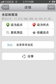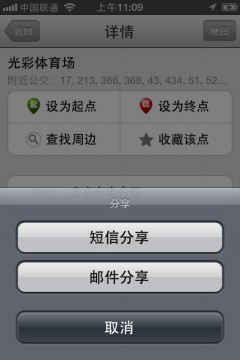 點(diǎn)擊某一個(gè)地點(diǎn),還可以查看到詳情,任意設(shè)為起點(diǎn)或終點(diǎn),并可查找周邊和收藏該地點(diǎn),更可以將這個(gè)地點(diǎn)通過(guò)郵件和短信分享給你的朋友。