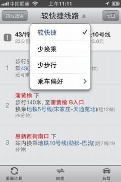 在我們獲取路線以后,界面上還會(huì)顯示到達(dá)地點(diǎn)需要的時(shí)間,路程等信息,地圖上也會(huì)用線條來(lái)展示出這個(gè)線路,特方便也特別直觀。還可以選擇多種路線形式,包括較快捷,少換乘,少步行等乘車偏好。