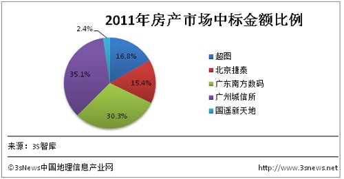 房產(chǎn)是國民經(jīng)濟(jì)中非常重要的一部分,而地理信息在房產(chǎn)測繪及房產(chǎn)管理等方面也起到很大的作用。在2011年地理信息項(xiàng)目中,房產(chǎn)領(lǐng)域中標(biāo)項(xiàng)目共計(jì)9個(gè),共計(jì)5家企業(yè)。從下圖可以看出,南方數(shù)碼和廣州城信各自占整個(gè)房產(chǎn)領(lǐng)域1/3的份額,剩余份額由國遙新天地、北京捷泰、及超圖軟件占據(jù)。