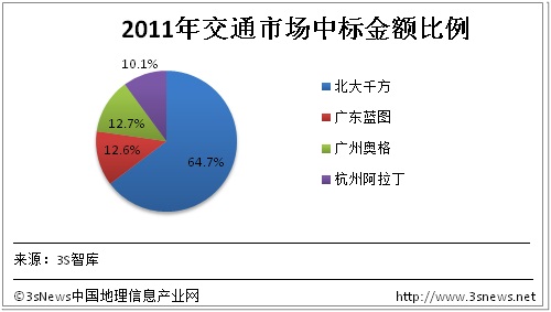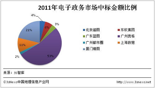 電子政務(wù)可以說并不是地理信息企業(yè)最為擅長的領(lǐng)域,但仍然有公司會(huì)接下不少國土、海洋等地理信息相關(guān)部分的電子政務(wù)項(xiàng)目,2011年度由3S智庫發(fā)布的電子政務(wù)中標(biāo)項(xiàng)目共計(jì)9個(gè),其中廣州奧格金額最大,占了一半以上份額,其次為廈門精圖21%,上海數(shù)慧11%,三家公司占了市場份額的86%,而且從圖中可以看出也有不乏如東軟集團(tuán)的IT企業(yè)加入到地理信息項(xiàng)目市場的爭奪戰(zhàn)中。