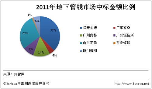 地下管線領(lǐng)域中,保定金迪、山東正元、廣州奧格占據(jù)前三位,市場份額分別為37%、29%和14%,總計(jì)超過3/4,除此之外,廣州城信所、西安煤航、廣東藍(lán)圖和廈門精圖也分別占有一定的份額,但總的來說,地下管線行業(yè)相對來說市場集中度比較高。