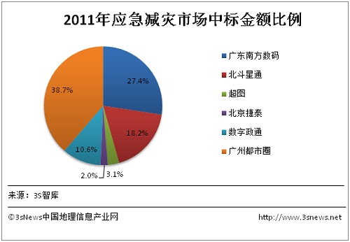 近年來,GIS在防洪消防、防洪防汛以及國土資源監(jiān)管中的應(yīng)用逐漸增多,在2011年的統(tǒng)計(jì)數(shù)據(jù)中,共有5期相關(guān)招投標(biāo)項(xiàng)目,其中由廣州都市圈中標(biāo)的“消防三維預(yù)案輔助決策指揮系統(tǒng)軟件”涉及金額約20萬,占到38.7%的市場份額,南方數(shù)碼和北斗星通分別以27.4%和18.2%的市場占有率次之。