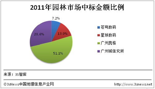 隨著國家對生態(tài)環(huán)境和城市綠化的重視不斷升級,GIS在園林綠化和林業(yè)病蟲害保護(hù)上的應(yīng)用也逐漸增多。在2011年的統(tǒng)計(jì)數(shù)據(jù)中,共有4項(xiàng)相關(guān)招投項(xiàng)目,涉及金額共計(jì)約148萬。其中廣州奧格以中標(biāo)的兩期“廣州市林業(yè)和園林局綠地?cái)?shù)據(jù)采集項(xiàng)目”占到51.1%的市場份額。
