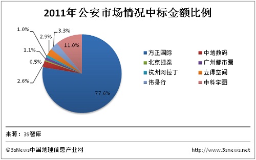 近年,警用地理信息系統(tǒng)建設(shè)遍地開花,因此,公安GIS市場也成為產(chǎn)業(yè)鏈上相關(guān)企業(yè)競爭的焦點(diǎn)。在2011年的統(tǒng)計(jì)數(shù)據(jù)中,方正國際從數(shù)據(jù)采集、采集硬件到平臺(tái)建設(shè),共獲得了6個(gè)大中型項(xiàng)目,占到了警用GIS市場77.6%的份額。