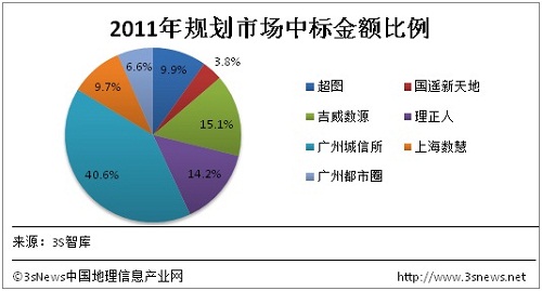 據(jù)不完全統(tǒng)計(jì),今年規(guī)劃領(lǐng)域共有15個(gè)招投標(biāo)項(xiàng)目,其中廣州誠信所中標(biāo)汕頭市、東莞市的規(guī)劃管理信息系統(tǒng)及1個(gè)城鄉(xiāng)規(guī)劃管理信息化平臺(tái)升級改造項(xiàng)目,以合計(jì)資金約72萬元占到40.6%的份額。另外,吉威數(shù)源、北京理正人分別以15.1%和14.2%的市場占有率次之。
