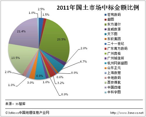 國土建設(shè)需求向來是GIS的大東家,其產(chǎn)業(yè)鏈上也聚集了較多的企業(yè)。在2011年的統(tǒng)計(jì)數(shù)據(jù)中,共有61個(gè)相關(guān)招投標(biāo)項(xiàng)目,涉及企業(yè)17家。其中東方道邇以3期 “2011年全國土地利用變更調(diào)查監(jiān)測與核查項(xiàng)目遙感數(shù)據(jù)采集項(xiàng)目”和“地理信息系統(tǒng)服務(wù)平臺(tái)、測量機(jī)器人和雙頻GPS設(shè)備”項(xiàng)目獲得了28.5%的市場份額。另外,中國四維以約2433萬的“2011年全國土地利用變更調(diào)查監(jiān)測與核查項(xiàng)目遙感數(shù)據(jù)采集項(xiàng)目”占到21.4%的份額,而西安煤航則主要以中標(biāo)“國家測繪地理信息局航空攝影項(xiàng)目”二期工程占得18.5%的份額。