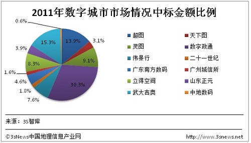 數(shù)字城市作為我國測繪地理信息“十二五”的工作重點(diǎn),在政企服務(wù)中占到了很大比重。據(jù)3S內(nèi)參統(tǒng)計(jì),2011年我國數(shù)字城市項(xiàng)目共計(jì)19個(gè),涉及十余家相關(guān)企業(yè)。其中數(shù)字政通以在數(shù)字城管上的3個(gè)大單占到了30.3%的份額,武大吉奧、超圖軟件分別15.3%和13.9%的中標(biāo)金額比例次之。
