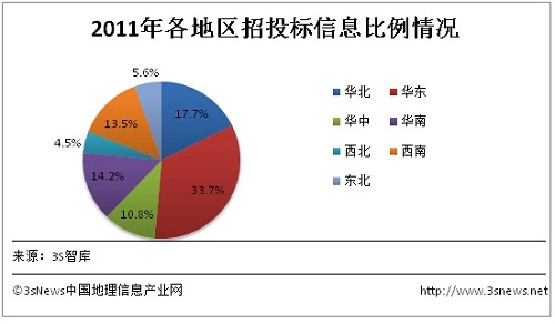 全國劃分為華北、華東、華中、華南、西北、西南、東北七個(gè)大區(qū),地理信息產(chǎn)業(yè)聚集性很高,在過去一年內(nèi),華北和華東的信息占一半以上,以浙江為首的華東地區(qū)占33.7%。華東地區(qū)可以說是國內(nèi)綜合技術(shù)水平最高的經(jīng)濟(jì)區(qū),地理信息發(fā)展迅速;其次,以北京為中心的華北地區(qū)占17.7%,北京是典型的企業(yè)和科研機(jī)構(gòu)高度集中的城市,高新技術(shù)產(chǎn)業(yè)眾多,地理信息作為其中一項(xiàng),亦得到政府的重視;另外,華南和西南的信息量不相上下,分別占14.2%和13.5%,華南地區(qū)的廣東和西南的四川明顯占據(jù)領(lǐng)先地位;華中地區(qū)緊隨期后,占10.8%;西北、西南的招投標(biāo)信息相對較少,不足20%。
