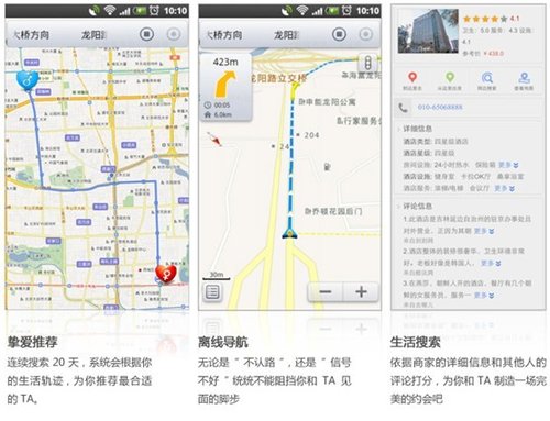 據(jù)了解,利用百度云計(jì)算智能分析系統(tǒng), “摯愛推薦”將為用戶推薦生活軌跡最為匹配的TA,在兩個(gè)人的手機(jī)里面顯示他們?cè)?jīng)擦肩而過的地點(diǎn),并啟動(dòng)導(dǎo)航,引導(dǎo)二人相見。同時(shí),百度地圖的生活搜索功能,還將為用戶顯示系統(tǒng)推薦的沿途花店和餐廳,并與這些商家達(dá)成了合作,用戶只要出示“摯愛推薦”的推薦頁面,相關(guān)消費(fèi)將免單。顯然,百度地圖不僅為用戶搭建了“浪漫相遇”的橋梁,更為后續(xù)的“激情相約”提供了場(chǎng)所。