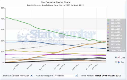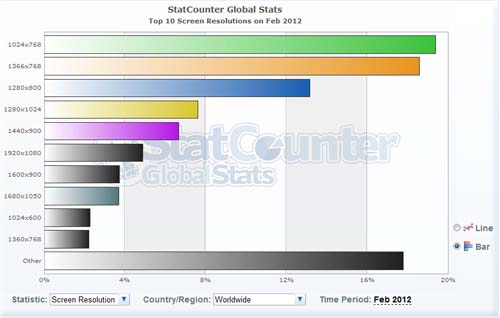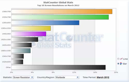 來自獨立網(wǎng)絡(luò)分析公司StatCounter的最新統(tǒng)計數(shù)據(jù)顯示,從2012年3月開始,1366×768已經(jīng)成為世界范圍內(nèi)最受歡迎的屏幕分辨率。在此之前的三年里一直都是1024×768這一尺寸,因此可將其視為一種標(biāo)志性的改變。
