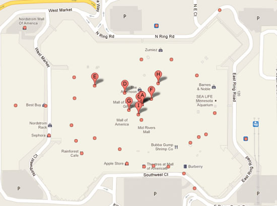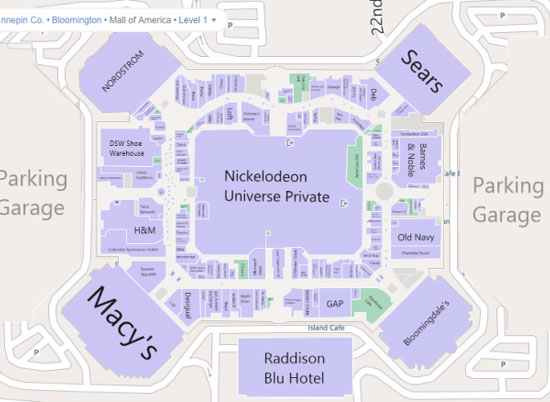 從下圖可以看出,Bing Maps(上)對場館地圖的顯示更加準(zhǔn)確,而Google Maps(下)顯示的比較簡單。Bing Maps將商場里每家商鋪的名稱、大小和具體形狀都清晰的展示出來,讓用戶很容易根據(jù)現(xiàn)場的環(huán)境來識別自己所處的位置。