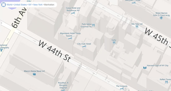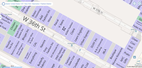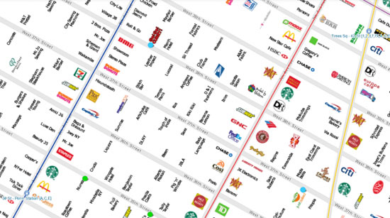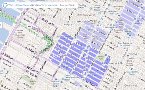 下圖是紐約時代廣場附近的城市地圖,該圖中Bing Maps將所有帶有室內(nèi)地圖的區(qū)域用藍(lán)色標(biāo)識出來。這樣用戶一眼就可以看出哪些地方有室內(nèi)地圖,并可以看到商家的名稱。