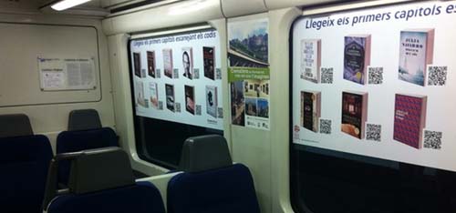 4月13日,西班牙某市的鐵路服務(wù)部與一家出版社合作,首批推出40本小說的下載。這些小說與相對應(yīng)的二維碼杯展示在列車車廂里的壁紙上,其中包括西班牙本地原創(chuàng)作家的作品,同時也有一些翻譯作品。