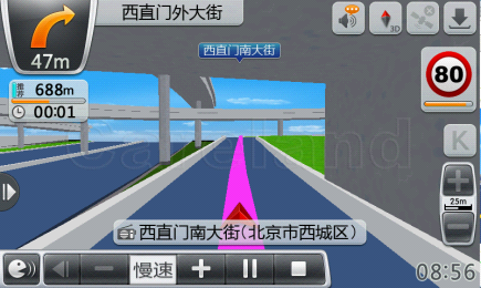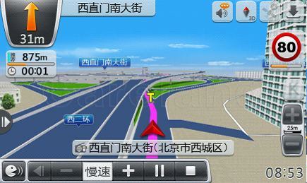 “立體道路”導(dǎo)航地圖的出現(xiàn)則改變了這種尷尬的局面。以記者的實(shí)際體驗(yàn)為例,在到達(dá)立交橋前,導(dǎo)航地圖就已經(jīng)顯示出該立交橋的3D圖像,橋上多條道路的關(guān)系與走向一覽無余,而粉紅色的導(dǎo)航路線則清晰地標(biāo)示出目的地方向的路線引導(dǎo), 再加上3D導(dǎo)航圖與真實(shí)道路場(chǎng)景的貼近性,發(fā)現(xiàn)正確的道路和方向變得比以往更加輕松易得。