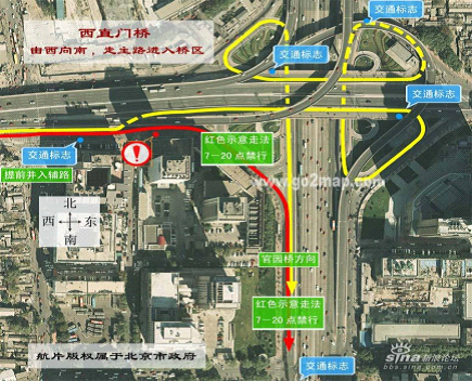 北京西直門立交橋由西向南正確路線(黃色示意圖)與錯(cuò)誤路線(紅色示意圖)