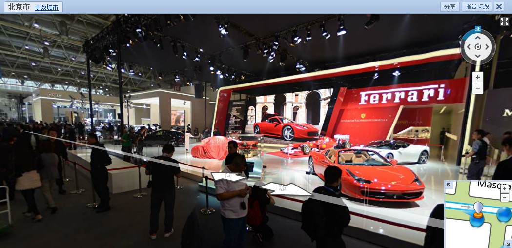 在SOSO地圖頻道(map.soso.com),用戶只要將城市選擇為北京,并將地圖比例尺調(diào)整至“市”就能看到一個(gè)藍(lán)色的汽車圖標(biāo)標(biāo)注在北京中國(guó)國(guó)際展覽中心的位置。點(diǎn)擊該圖標(biāo)即可進(jìn)入車展街景的模式,默認(rèn)顯示的是E4館法拉利的展臺(tái)。SOSO地圖的北京車展街景覆蓋了車展從E1到E5和W1到W4的所有場(chǎng)館,車友們按照路線在網(wǎng)上參觀便可以大飽眼福了。