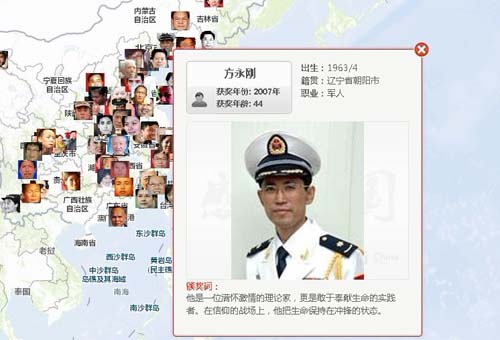 一個(gè)是感動(dòng)中國(guó)人物。這是把歷年感動(dòng)中國(guó)人物來(lái)自中國(guó)哪些地方,在地圖上呈現(xiàn)出清晰直觀的介紹。當(dāng)我們進(jìn)入該專題故事,可以發(fā)現(xiàn)中國(guó)地圖上有許多感動(dòng)中國(guó)人物,點(diǎn)擊人物頭像,即可了解該人物的背景詳述,簡(jiǎn)潔明了。當(dāng)然還可以通過(guò)檢索年份,有篩選地尋找特定年份的感動(dòng)中國(guó)人物。