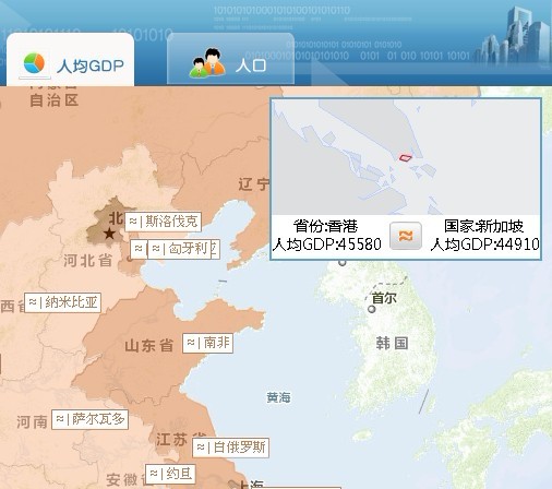 另一個(gè)專題是圖說(shuō)GDP。在地圖上,我們可以找到我們的家鄉(xiāng),然后查看我們的家鄉(xiāng)GDP水平,和哪些國(guó)家地方的GDP水平相似。該地圖故事中提供了GPD、人均GDP、人口三個(gè)數(shù)據(jù)的對(duì)比,比如我們選中山東省的人均GDP,會(huì)發(fā)現(xiàn)山東省的水平和南非國(guó)家的人均GDP水平相當(dāng)。