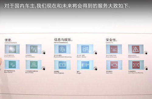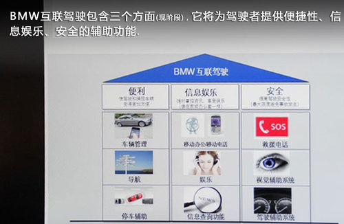目前BMW互聯(lián)駕駛系統(tǒng)主要包括三大方面:1、舒適性,如全景顯示功能、駐車輔助、藍牙連接功能等;2、安全性,如平視顯示、夜視、主動定速巡航、車道偏離警告等;3、信息娛樂方面,如藍牙流媒體、智能手機與iDrive系統(tǒng)的集成等功能。因此實際上很多寶馬車主已經(jīng)率先體驗到了BMW互聯(lián)駕駛系統(tǒng)了。
