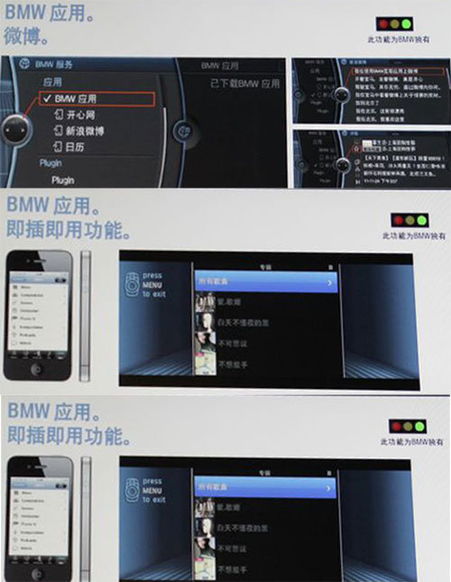 但是這一次北京車展上不同以往的是,BMW互聯(lián)駕駛系統(tǒng)帶來了一個新的有意思的玩意兒——與Iphone手機的功能整合與擴展。首先,針對中國市場“BMW互聯(lián)駕駛”系統(tǒng)已經(jīng)開發(fā)了四個應用程序,包括開心網(wǎng)、新浪微博、日歷和與百度合作的音樂播放軟件ting。而上述軟件目前僅基于Iphone手機,“BMW互聯(lián)駕駛”系統(tǒng)專家表示未來將會嘗試與Android安卓系統(tǒng)的接駁。上述軟件在與BWM車型鏈接后相關(guān)信息均可以顯示在中央顯示屏上,同時在車輛靜止或10公里時速以下還可以欣賞手機中的視頻文件。