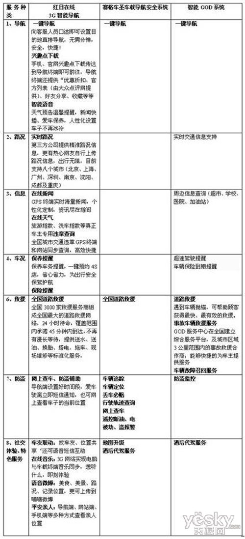 從以上各項(xiàng)指標(biāo)的PK我們不難看出,從功能應(yīng)用上比較,賽格車(chē)圣車(chē)載導(dǎo)航安全系統(tǒng)側(cè)重于防盜、一鍵導(dǎo)航,但車(chē)聯(lián)網(wǎng)的社交體驗(yàn)、特色服務(wù)等均未涉及,僅僅把服務(wù)人工后臺(tái)和車(chē)機(jī)通過(guò)3G網(wǎng)絡(luò)聯(lián)系起來(lái),不能算作真正意義上的車(chē)聯(lián)網(wǎng)服務(wù)。智成服務(wù)種類(lèi)也較為單一,其服務(wù)涉及信息查詢、一鍵導(dǎo)航、防盜輔助、線下增值服務(wù)等, 與真正意義上的車(chē)聯(lián)網(wǎng)服務(wù)還有一定距離。對(duì)比起來(lái),紅日在線能實(shí)現(xiàn)的功能就豐富得多了,包含導(dǎo)航、信息、路況、車(chē)況、救援、防盜、社交服務(wù)等十多項(xiàng)契合車(chē)主需求的功能,賣(mài)點(diǎn)十足,賺足噱頭。