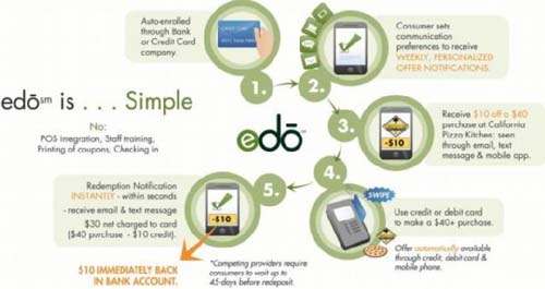 在今天舊金山舉辦的Finovate大會(huì)上,一家叫做edo的創(chuàng)業(yè)公司展示了一種全新概念“geocommerce“,也就是基于地理位置的商務(wù),將商家報(bào)價(jià)以及交易與地理位相聯(lián)系,不過(guò)用戶不用簽到,不用移動(dòng)應(yīng)用,沒(méi)有特殊硬件,在商家POS端無(wú)法進(jìn)行報(bào)價(jià)修改,盡最大的努力讓消費(fèi)者“衣來(lái)伸手飯來(lái)張口”。Edo依靠消費(fèi)者的銀行卡,一旦結(jié)賬, 不但能立即獲得折扣返還,還能立即收到其它報(bào)價(jià)。