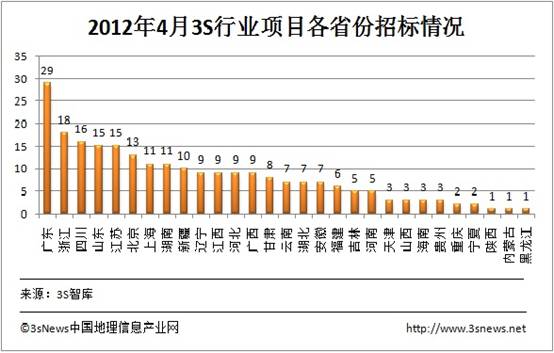 圖1:2012年4月3S行業(yè)項(xiàng)目各省份招標(biāo)情況