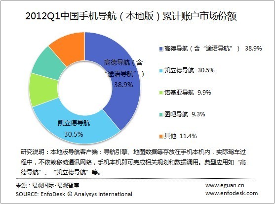 根據(jù)EnfoDesk易觀智庫(kù)產(chǎn)業(yè)數(shù)據(jù)庫(kù)《2012年第1季度中國(guó)手機(jī)導(dǎo)航客戶端市場(chǎng)監(jiān)測(cè)報(bào)告》顯示,高德導(dǎo)航(含“途語(yǔ)導(dǎo)航”)、凱立德導(dǎo)航及諾基亞導(dǎo)航分別以38.9%、30.5%及10.7%的份額繼續(xù)保持中國(guó)手機(jī)導(dǎo)航客戶端用戶市場(chǎng)前三名的位置。