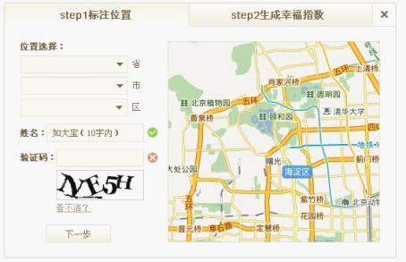 此次推出的午餐幸福指數(shù)活動(dòng)參與方式極其簡(jiǎn)單。用戶只要在活動(dòng)頁(yè)面左側(cè)下拉框選擇自己所在的省市區(qū),即可在右側(cè)圖區(qū)推動(dòng)水滴進(jìn)行精準(zhǔn)位置定位。再此基礎(chǔ)上填入自己的昵稱和驗(yàn)證碼之后,即可進(jìn)入下一步并生成幸福指數(shù),根據(jù)用戶不同幸福指數(shù)顯示出全國(guó)的排名情況。