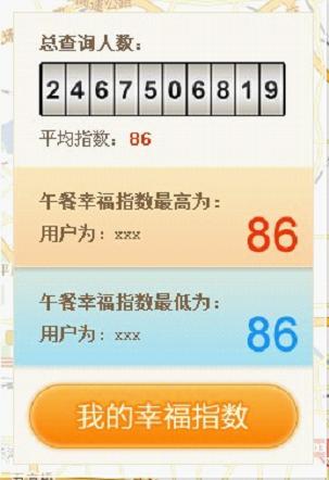 除了查看自己的指數(shù)外,用戶還可以在活動(dòng)首頁(yè)的右側(cè)看到總查詢數(shù),以及平均幸福指數(shù)、最高幸福指數(shù)、最低幸福指數(shù)等,看看相比之下自己的幸福程度如何。