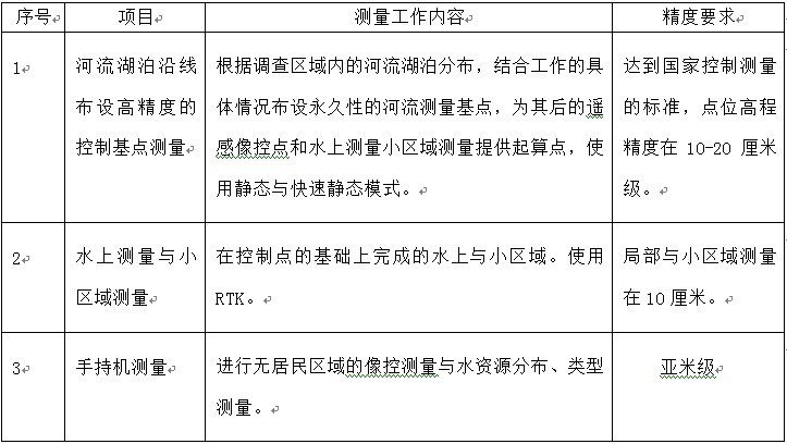 對以上河流湖泊普查的GPS測量方式進(jìn)行分析、總結(jié)并結(jié)和具體的測量手段,可以把河流調(diào)查測量工作情況顯示如下表1-1所示: