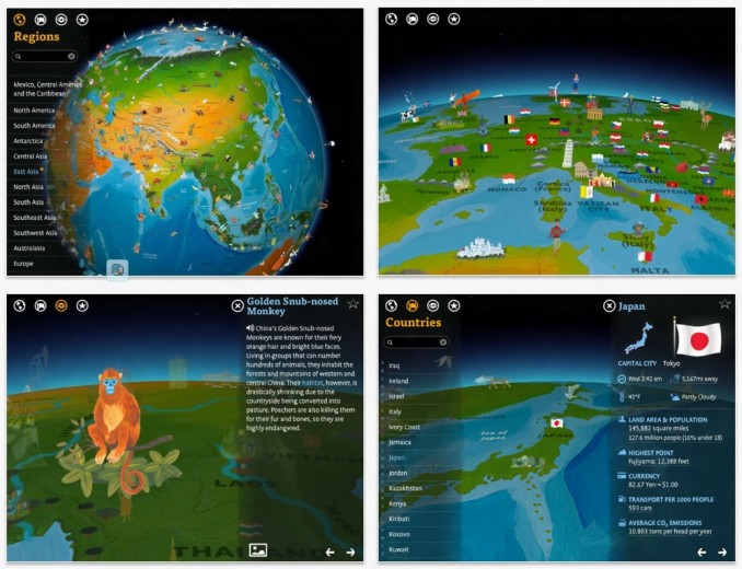 這個(gè)3D地球應(yīng)用叫做Barefoot World Atlas,它將紙質(zhì)的Barefoot Books地圖集做成了App。該應(yīng)用充分利用了iPad視網(wǎng)膜屏幕、3D動(dòng)畫演示及各種交互元素,讓孩子們?cè)敢鈽反瞬黄5娜ヌ剿鬟@個(gè)神奇的地球,并從中學(xué)習(xí)大量的地理知識(shí)。