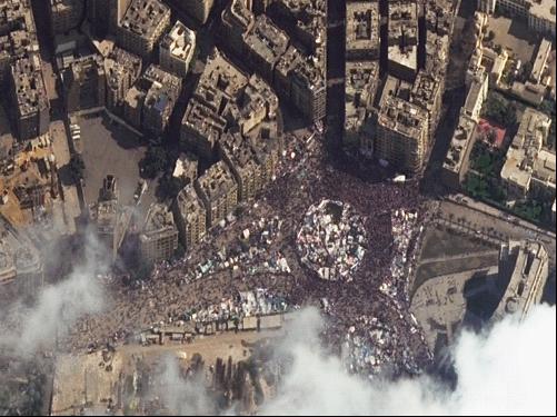 2011年中東發(fā)生了許多大事件,大批民眾紛紛走上街頭抗議,例如眾所周知 “阿拉伯之春”運動。上圖為2011年2月,塔里爾廣場出現(xiàn)大規(guī)模民眾聚集事件的衛(wèi)星影像