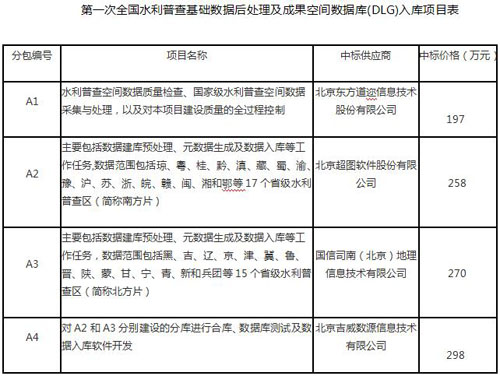 第一次全國水利普查基礎(chǔ)數(shù)據(jù)后處理及成果空間數(shù)據(jù)庫(DLG)入庫項目已經(jīng)定標(biāo),項目共分4個包,分別由4家公司中標(biāo)。項目中標(biāo)金額最大為298萬元,中標(biāo)單位是北京吉威數(shù)源信息技術(shù)有限公司;最低為197萬元,中標(biāo)單位為北京東方道邇信息技術(shù)股份有限公司;共計1023萬元人民幣。